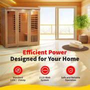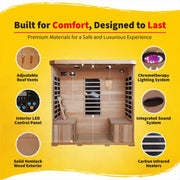 FAR Infrared Heat ⢠9 Carbon Heaters ⢠4-Person Capacity ⢠Solid Hemlock ⢠2100W ⢠120V ⢠Ionizer ⢠LED Lighting ⢠Audio Jacks ⢠cETL Listed ⢠FREE Shipping